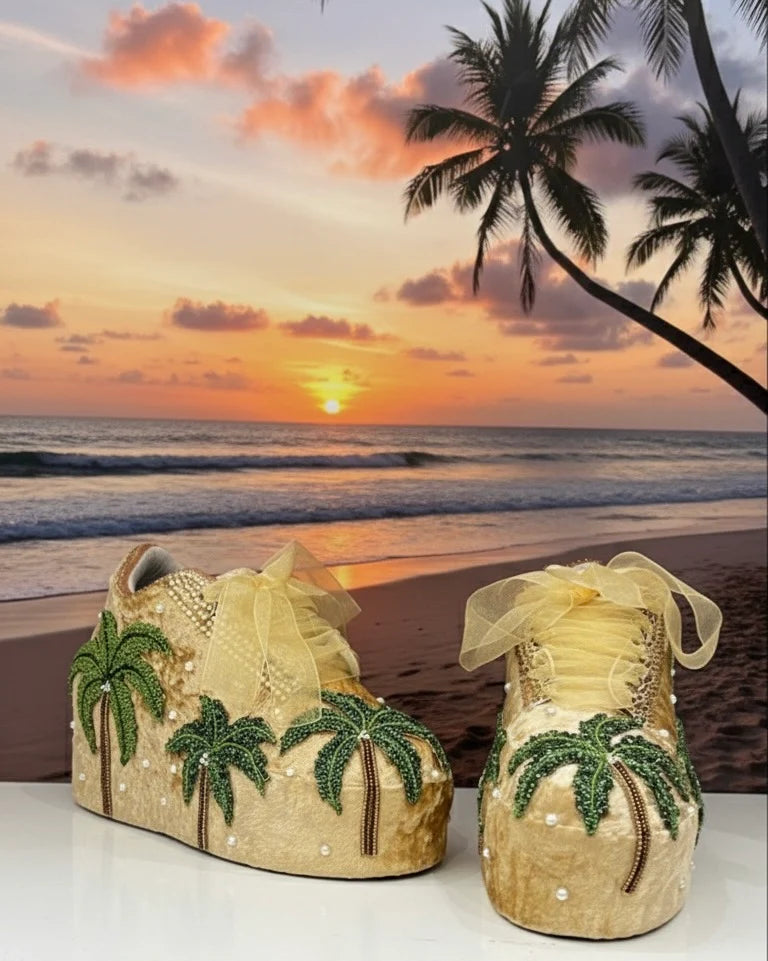 Golden bridal platform sneakers adorned with hand-beaded palm tree designs and pearl accents. Perfect for beach weddings, destination brides, and tropical-themed celebrations.